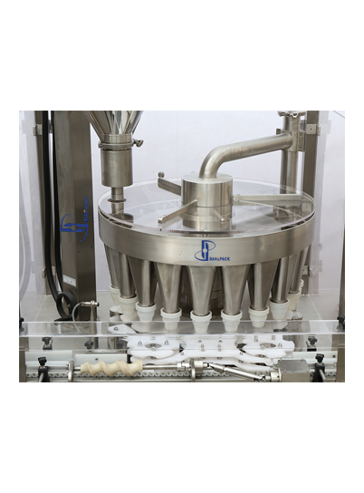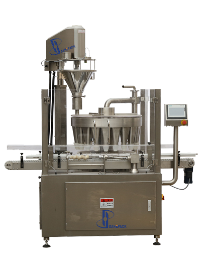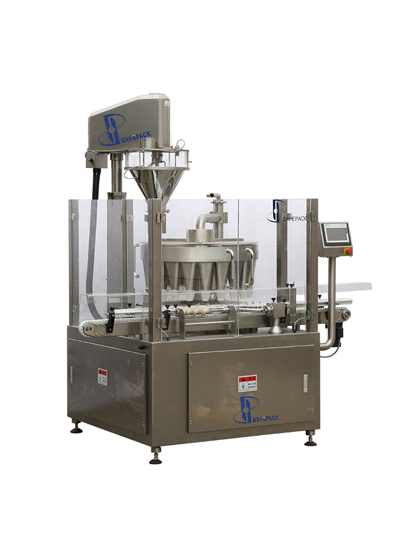 旋轉(zhuǎn)式充填機具有很高的生產(chǎn)效率和生產(chǎn)速度,即使在非??量痰纳a(chǎn)要求下,旋轉(zhuǎn)式充填系統(tǒng)將物料連續(xù)的分發(fā)到旋轉(zhuǎn)的多工位漏斗里,瓶子在漏斗下,一個瓶子對應(yīng)一個漏斗,不等距螺旋和星形轉(zhuǎn)盤將瓶子均勻的對應(yīng)到每一個漏斗下同步旋轉(zhuǎn)并振動,螺桿計量機精確的將物料充填到漏斗里,然后物料在星形轉(zhuǎn)盤旋轉(zhuǎn)四分之三圈的時間內(nèi)從漏斗落到瓶子里,特別適用于瓶子口徑小,但包裝速度要求高的各種粉末和小顆粒物料。
