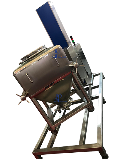 2,回轉(zhuǎn)體(混合料斗)與回轉(zhuǎn)軸線成30°夾角,混合料斗中的物料隨回轉(zhuǎn)體翻動(dòng)外,同時(shí)沿斗壁做切向運(yùn)動(dòng),產(chǎn)生 強(qiáng)烈的翻轉(zhuǎn)和高速的切向運(yùn)動(dòng),從而達(dá)到混合效果。