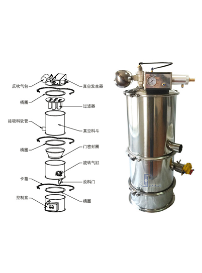氣動式真空上料機是利用壓縮空氣通過真空發(fā)生器產(chǎn)生高真空實現(xiàn)對物料的輸送,不需要機械式真空泵,具有結構簡單、體積小、免維修、噪音低、控制方便、消除物料靜電和符合GMP要求等優(yōu)點