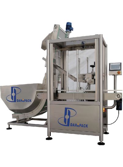 整機主體不銹鋼結構,有機玻璃外罩,可打開; PLC控制、觸摸屏人機界面顯示,操作簡便; 儲蓋料斗底部的爬坡輸送帶自動理蓋,方向對的向上提,方向反的自動跌落到儲蓋料斗;